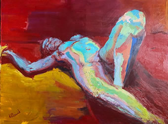The figure’s nudity is not meant to provoke but to reveal she is unguarded, yet not exposed. The hat, a recurring motif in my work, becomes a shield here, a veil that turns the gaze inward rather than outward.