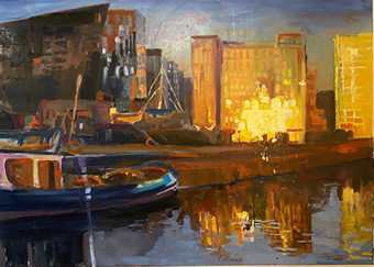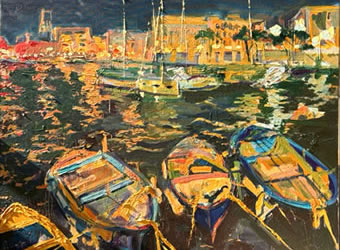 The painting carries a sense of presence without needing people. The worn boats, the reflections, and the glow from the distant shore suggest stories untold, moods felt, time passing slowly. It’s a work that doesn’t just show what the place looks like it shows what it feels like.