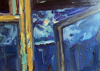 The bold strokes of golden yellow anchor the composition, cutting through the cool blue depths, hinting at structure—maybe an old wooden doorframe or a cityscape at night. The swirling patches of lighter blue and white suggest the reflection of the sky or even a glowing moon, adding a sense of mystery and fluidity to the piece.