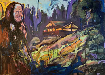 Behind her, the wooden house glows warmly, a symbol of shelter and continuity. The forest rises in deep purples and blues, mysterious and almost otherworldly, reminding us that nature is vast and eternal. The sloping meadow in the center vibrates with unexpected colors greens, yellows, pinks, and blues showing that memory and emotion transform landscapes into something beyond realism.